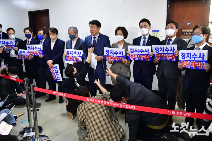 더불어민주당 법사위 기동민 간사와 의원들이 20일 서울 여의도 국회 법제사법위원회 전체회의실 앞에서 민주당 중앙당사 압수수색 시도와 관련 규탄 기자회견을 하고 있다.