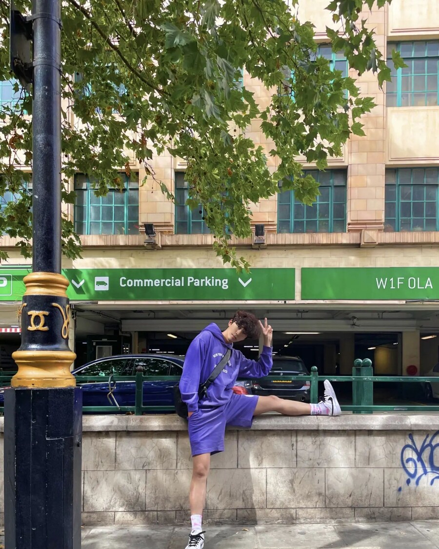 사진 속 임영웅은 보라빛 후드티와 반바지를 입고 펌 헤어를 한 채 상큼한 매력을 뽐내고 있다.