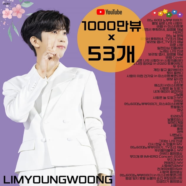 가수 임영웅이 유튜브 공식 채널에 천만뷰 영상을 53개나 보유하게 되었다 , 28일 기준 조회수 1000만 뷰를 넘긴 영상이 53개나 보유하게 되면서 명실상부 국내 유튜브 제왕으로 우뚝 올라섰다.