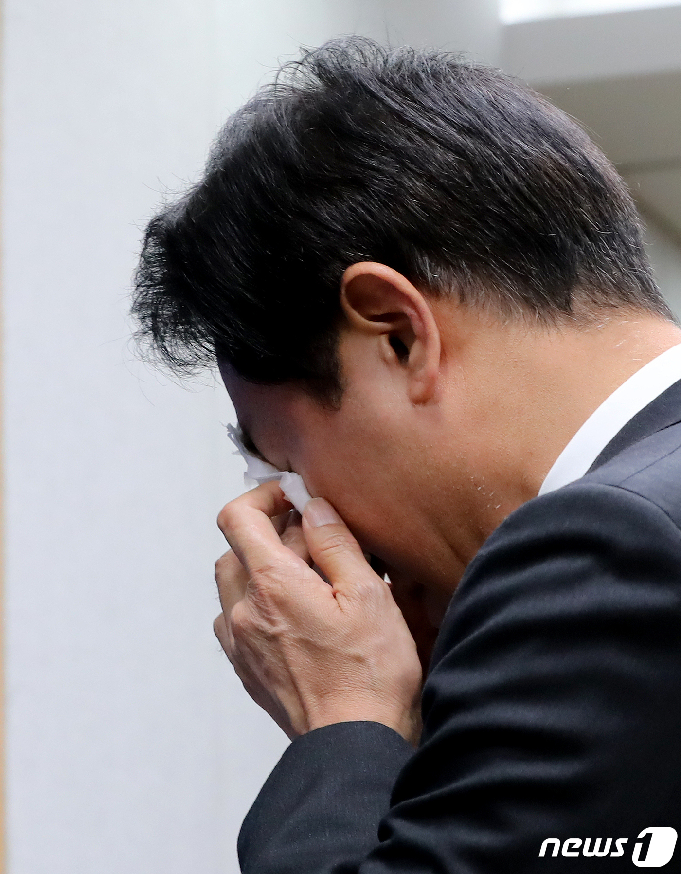 (서울=뉴스1) 장수영 기자 = 오세훈 서울시장이 1일 오후 서울시청 브리핑실에서 이태원 사고 관련 입장발표를 하던 중 등을 돌린 채 눈물을 닦고 있다. 오 시장은 "시민의 생명과 안전을 책임지는 서울특별시장으로서 이번 사고에 대해 무한한 책임을 느끼며 깊은 사과의 말씀을 드린다"며 공식 사과했다. 2022.11.1/뉴스1