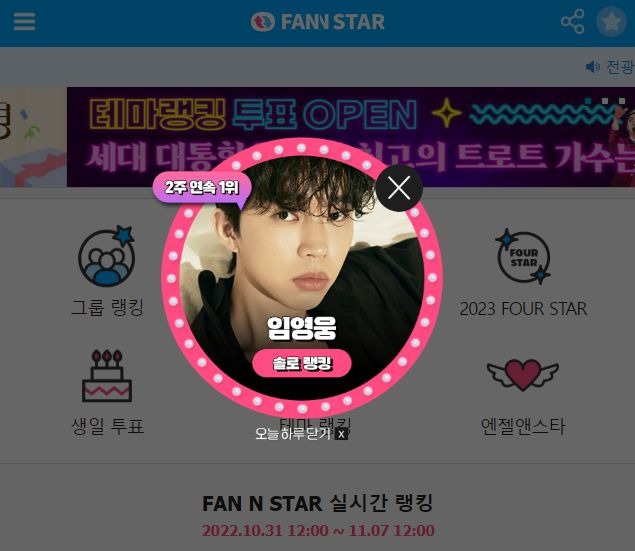 '팬앤스타' 10월 넷째 주 솔로 랭킹 투표에서 3534만 4620표 득표