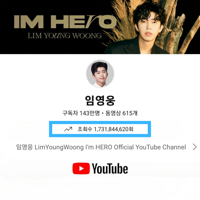 5일 기준 임영웅 공식 유튜브 채널 ‘임영웅’에 따르면 총 조회수가 17억3000만뷰를 넘어섰다. 이에 임영웅은 또 한 번의 기록을 경신한 셈이다.