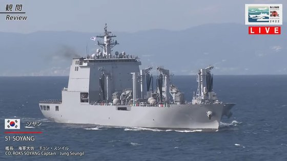 해군 군수지원함 소양함이 6일 일본이 개최한 국제관함식에 참가해 해상사열에 나섰다. 일본 해상자위대 유튜브 영상 캡처 |