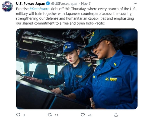 주일미군은 이번 훈련과 관련해 공식 트위터에 "킨 소드가 10일 시작돼 미군과 자위대가 일본 전역에서 훈련한다"며 "방위와 인도주의적 능력을 강화하고 '자유롭고 개방된 인도·태평양'에 대한 공통의 약속을 강조한다"고 밝혔다.