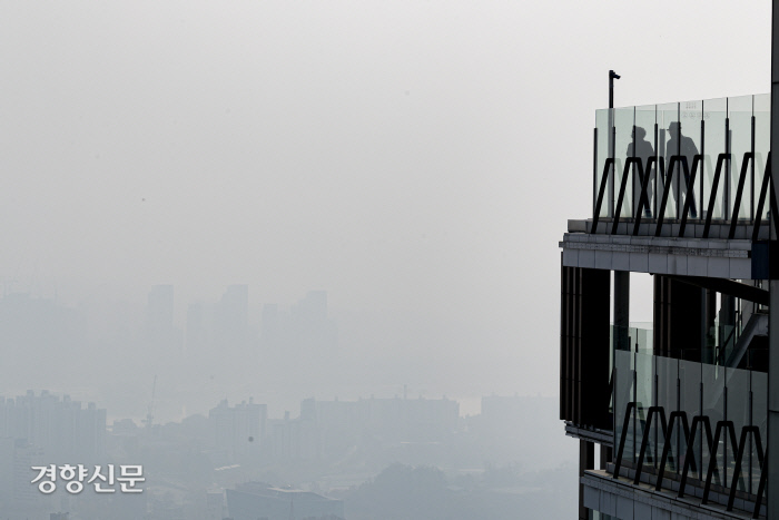 서울 용산구 남산을 찾은 시민들이 뿌연 도심을 보고 있다. |