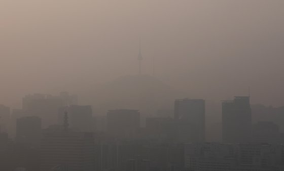 10일 인왕산에서 내려다본 서울시내가 미세먼지와 안개로 뿌옇다. 기상청은 이날 내륙 곳곳의 짙은 안개와 수도권 미세먼지 농도 '나쁨'을 예보했다. 연합뉴스 |