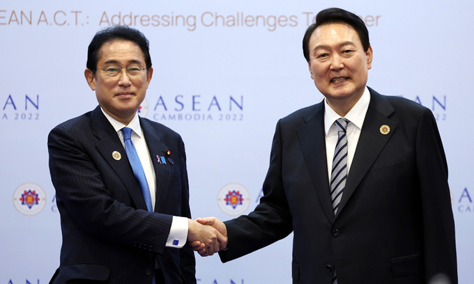 한·일 정상은 이날 캄보디아 프놈펜의 한 호텔에서 45분 동안 회담을 했다. 애초 예상됐던 30분을 훌쩍 넘겼다. 기시다 총리가 회담에 앞서 ‘이태원 압사 참사’ 유가족과 한국 국민에 대한 애도를 표명했고, 윤 대통령은 2명의 일본인 희생자에 대한 조의를 표했다.