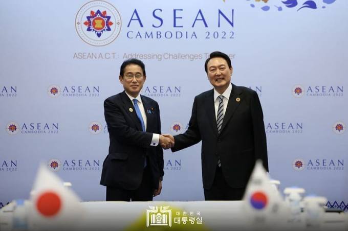 윤석열 대통령과 기시다 후미오 총리는 13일(현지시각) 캄보디아 프놈펜에서 제17차 동아시아정상회의(EAS)에 참석한 후 양자회담을 가졌다. 한일 정상이 만난 것은 지난 9월 유엔총회 당시 미국 뉴욕에서 약식회담을 가진지 2개월만이다. 공식 정상회담으론 2019년 12월 이후 약 3년 만이다.