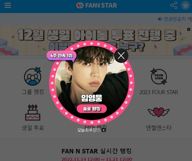 '팬앤스타' 11월 둘째 주 솔로 랭킹 투표에서 3693만 8498표 득표