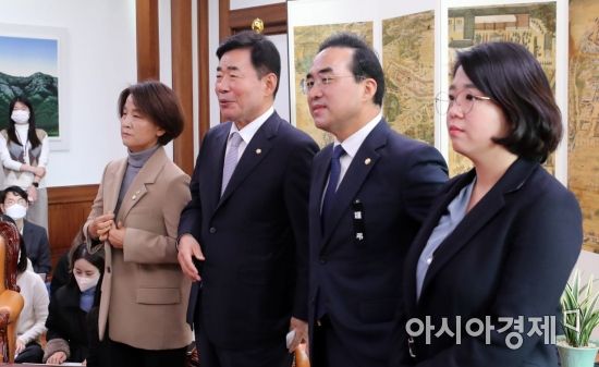 15일 야3당을 대표해 박홍근 더불어민주당 원내대표와 진성준 원내수석부대표, 이은주 정의당 원내대표와 장혜영 원내수석부대표, 용혜인 기본소득당 원내대표가 김 의장을 찾아 회동했다.