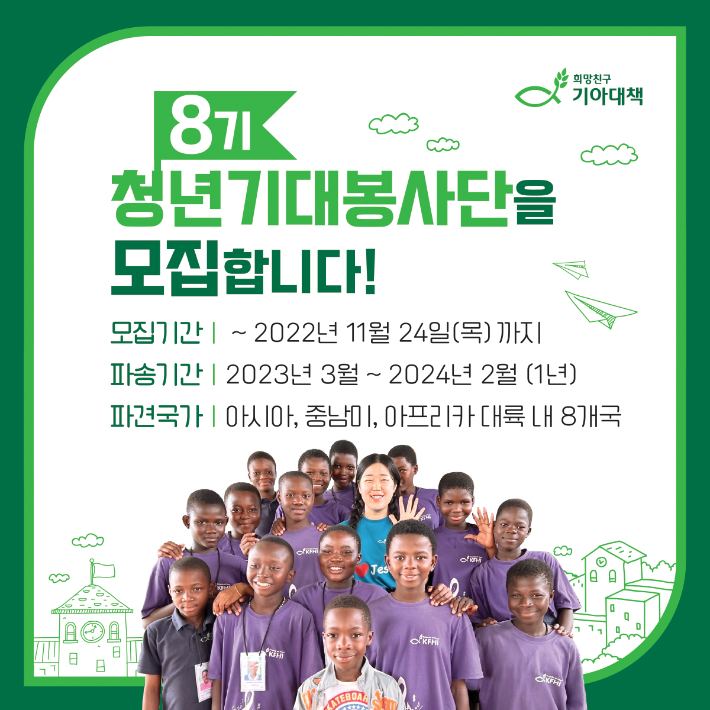 희망친구 기아대책이 오는 24일까지 2,30대 청년을 대상으로 한 단기선교사 파송 프로그램, '청년기대봉사단' 8기 참가자를 모집합니다.