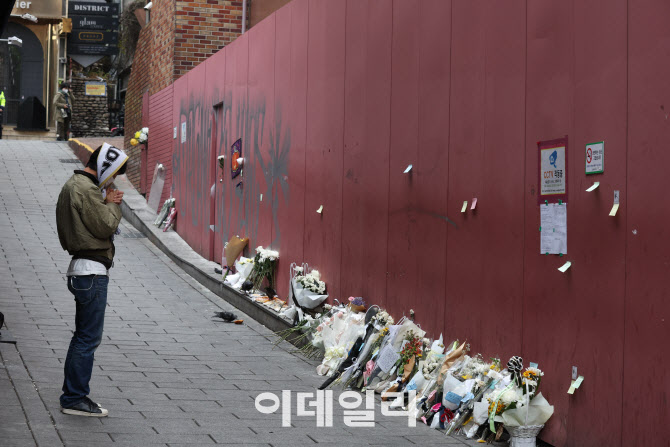경찰 사고 현장 통제선을 제거한 지 이틀이 지난 13일 서울 용산구 이태원 참사 현장에 마련된 추모공간에서 한 시민이 추모하고 있다. (사진=이데일리 이영훈 기자) |