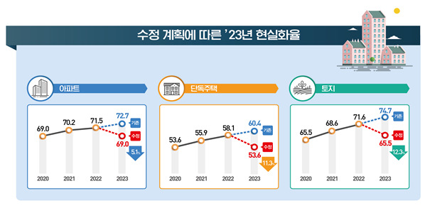 공시가격 현실화 수정 계획에 따른 현실화율 인하로 인해 2022년 대비 2023년 공시가격은 평균 올해 보다 공동주택 3.5%, 단독주택 7.5%, 토지 8.4% 하락할 예정이다. 국토부 관계자는 "내년도 최종 공시가격은 올해 부동산 시세 변동분을 반영해 결정될 예정"이라고 말했다.