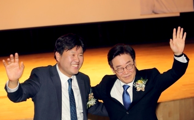 2019년 12월 ‘김용의 북콘서트’에서 김용 민주연구원 부원장(왼쪽)과 이재명 더불어민주당 대표가 함께 포즈를 취하고 있다. 김용 부원장 블로그 갈무리 |