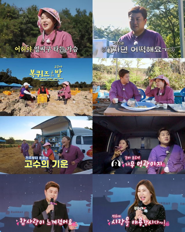 본격적으로 고구마 캐기에 착수한 두 사람은 35년 차 베테랑 조교의 시범을 지켜본 뒤 자신만만하게 미션에 도전했지만, 김호중은 손대는 것마다 상처를 냈다. 실수를 연발한 끝에 상차 작업으로 포지션을 변경한 그는 상자들을 빠르게 정리해 자존심을 회복했다. 허당미로 뜻하지 않게 웃음을 선사한 김호중과 달리, 송가인은 야무진 손놀림으로 칭찬을 받았다. 그는 순식간에 고구마 5박스를 채워 주변 어머님들로부터 칭찬 세례를 받았고, ‘개나리 처녀’ 즉흥 라이브를 선보여 고된 노동에 지쳐가는 이들에게 활력을 줬다.