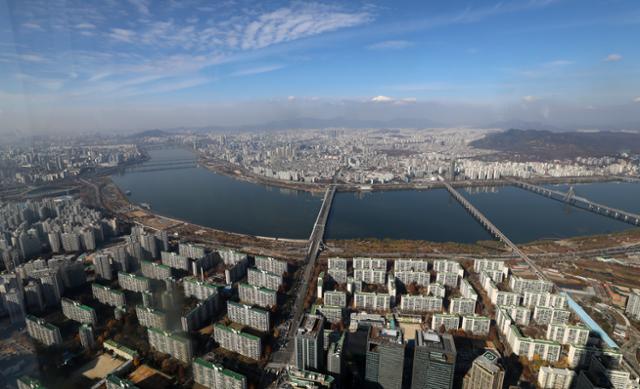 서울의 미세먼지 농도가 '보통'이었던 20일 오후 서울 송파구 롯데월드타워에서 바라본 한강변 풍경. 뉴스1 |