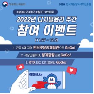 행사 마지막 날인 2일에는 '2022년 디지털 윤리 대전'에서 '디지털 윤리 비전'이 선포되고, 디지털 윤리 창작 콘텐츠 공모전 시상과, 인터넷·통신 이용자 보호 유공자에 대한 표창과 정부포상이 진행된다.