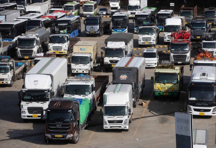 [서울=뉴스핌] 윤창빈 기자 = 화물연대 총파업이 사흘째 이어지고 있는 26일 오전 서울 양천구 서부트럭터미널에 화물차들이 주차돼 있다. 2022.11.26 pangbin@newspim.com |