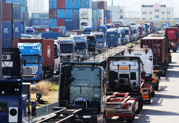 화물연대 총파업 나흘째인 27일 오전 경기도 의왕시 내륙컨테이너기지(ICD)에 화물차들이 가득 주차돼 있다. |