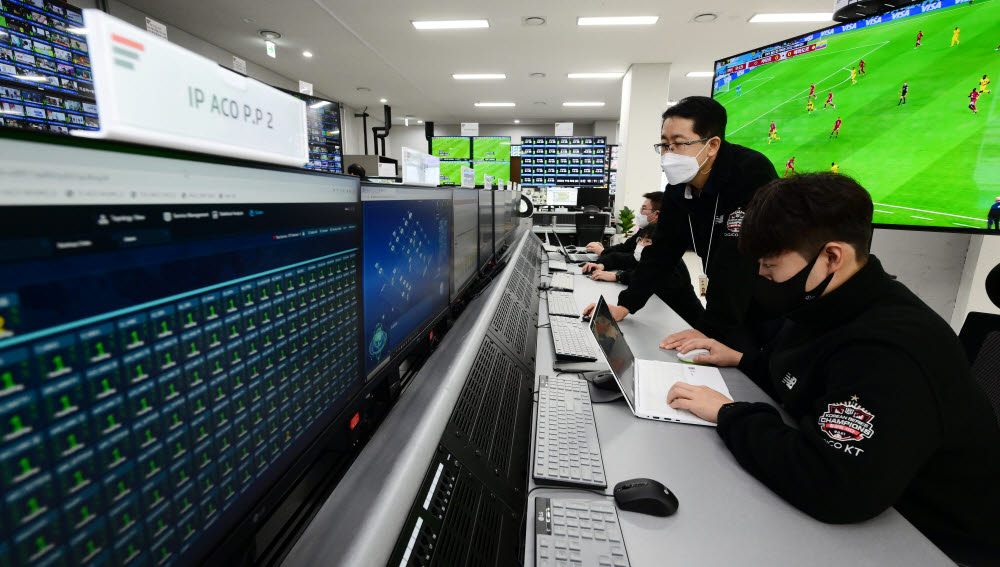 KT는 지난 20일(현지시간)부터 카타르 월드컵 경기 영상물을 지상파방송사에 제공하고 있다. KT는 끊김 없는 방송을 위해 국제해저케이블 구간을 2개 주요 경로와 3개 예비 경로로 다중화, 카타르 도하 국제방송센터(IBC)와 지상파방송사 간에 총 5개 경로를 마련했다.