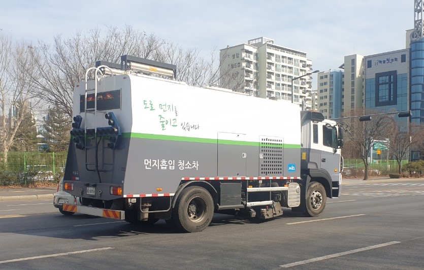 서울 마포구가 미세먼지를 줄이기 위해 운영하는 먼지 흡입 청소 차량이 도로 위에 쌓여 있는 먼지를 빨아들이고 있다.마포구 제공 |