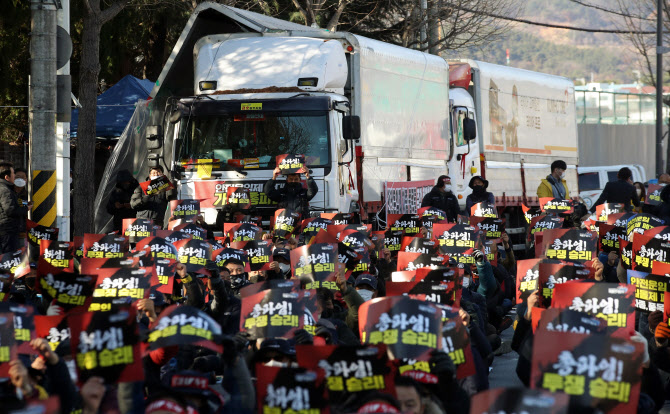 아울러 부산신항 도로에서 운행 중이던 화물 차량 2대를 향에 쇠구슬을 발사한 화물연대 조합원 A씨 등 3명에 대해선 이날 오전 체포영장을 집행했다. A씨 등은 지난달 26일 부산신항에서 화물연대 파업에 동조하지 않은 비조합원들의 화물 차량을 향해 쇠구슬을 발사한 혐의를 받는다. 이들은 차량 유리창·안개등을 파손하고 운전자 목 부위에 상해를 가한 것으로 전해졌다.