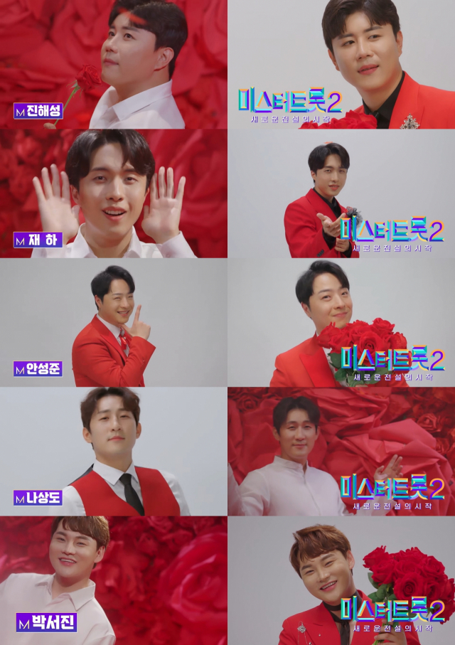 7일 TV조선 새 예능프로그램 '미스터트롯2-새로운 전설의 시작'(이하 '미스터트롯2') 측은 "지상파 3사에서 마련했던 트롯 오디션에서 우승과 준우승 경력이 있는 진해성, 재하, 나상도, 안성준, 박서진이 출사표를 던졌다"고 밝혔다.