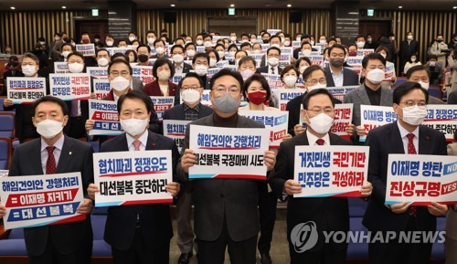 구호 외치는 국민의힘 의원들 |