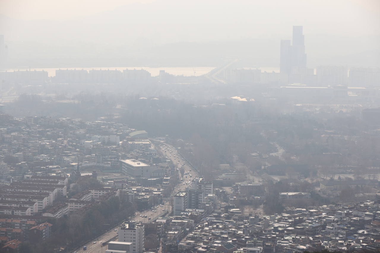 서울·인천·경기북부 등에 오후 일시적으로 미세먼지 농도 ‘나쁨’이 예보된 9일 오후 서울 시내가 미세먼지 등으로 뿌옇게 보인다. [연합] |