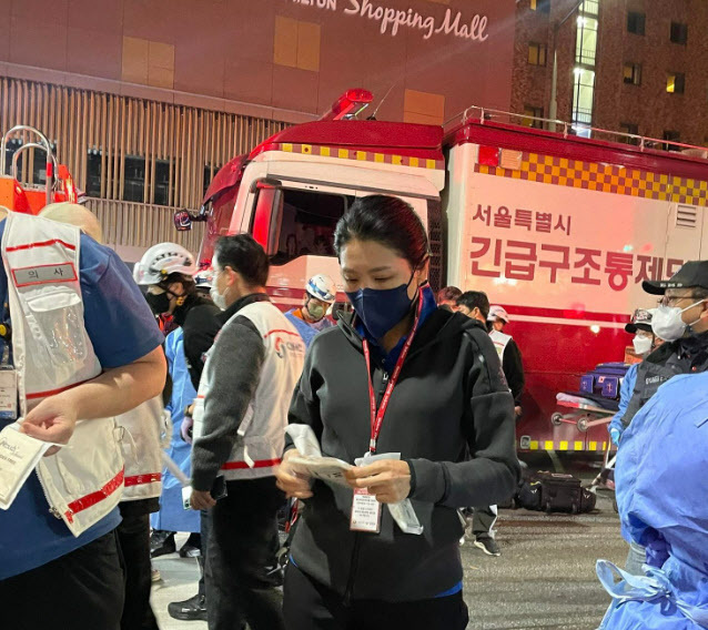 신현영 더불어민주당 의원이 지난 10월30일 서울 이태원 참사 현장에서 재난의료지원팀(DMAT)으로 지원해 구호활동을 하는 모습. 신현영 의원 페이스북 캡처 |