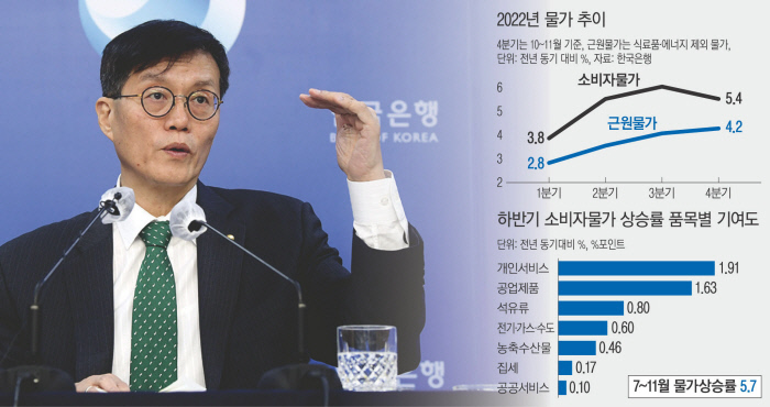 수요 측면에서는 강한 긴축의 여파로 성장세가 둔화하면서 물가 상승 압력도 약해질 것으로 내다봤다. 한은은 내년도 한국 경제가 1.7% 성장하는 데 그칠 것으로 전망하고 있다. 반기 성장률은 상반기 1.3%, 하반기 2.1%의 상저하고 흐름을 보일 것으로 예상된다. 다만 유류세 인하폭 단계적 축소, 전기·가스요금 인상 등의 정부 정책도 향후 물가 흐름에 적지 않은 영향을 미칠 가능성이 있다.