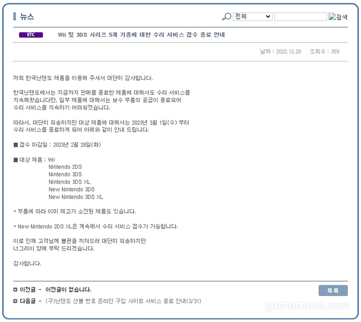 한국닌텐도는 지난 20일, 공식 홈페이지를 통해 자사 콘솔 6개 기종의 수리 서비스 접수 종료를 공지했다. 대상 제품 목록에는 닌텐도 2DS, 3DS 시리즈 등이 있으며, 2008년에 국내에 정식 출시된 닌텐도 Wii도 포함돼 있다. 서비스 종료 이유는 본사로부터 보수 부품 공급이 끝났기 때문이며, 내년 2월 28일부로 서비스 접수가 완전히 마감된다. 참고로 일본에서는 2020년 2월부터 Wii 수리 서비스가 종료됐다. 국내에서도 2019년부터 구형 Wii의 수리 서비스를 종료하고 2014년 이후 발매된 신형 Wii의 수리 서비스만 접수할 수 있었다.