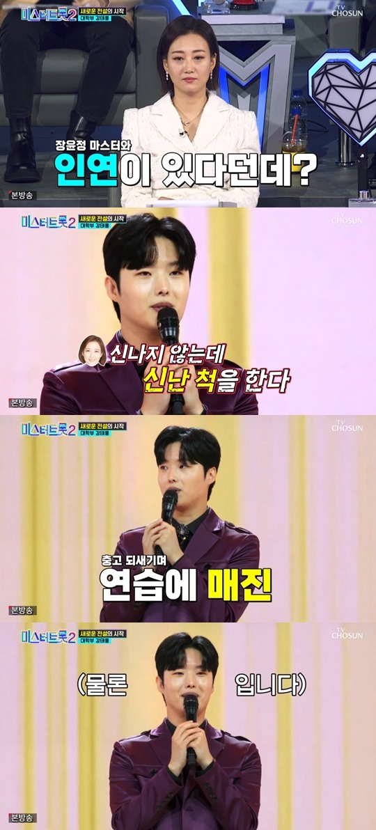 22일 첫 방송된 TV CHOSUN '미스터트롯2-새로운 전설의 시작(이하 미스터트롯2)' 대학부 경연에서 강태풍이 무대에 오르자, MC 김성주는 "장윤정 마스터와 인연이 있다던데" 라고 물었다. 그러자 강태풍은 "예전에 장윤정 마스터 선배님께서 신나지 않는데 신난 척을 한다는 말씀을 하신 적이 있다" 고 털어놨다.