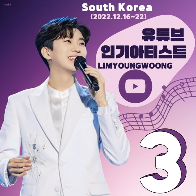 가수 임영웅이 유튜브 인기 아티스트 전체 TOP3를 남자 솔로가수로는 1위를 기록했다.