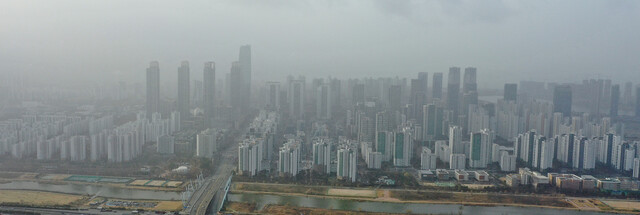 인천 동남부 지역에 미세먼지 경보가 내려진 지난 13일 오전 인천시 연수구 동춘터널에서 바라본 송도국제도시가 미세먼지와 해무로 뿌옇게 보이고 있다. 연합뉴스 |