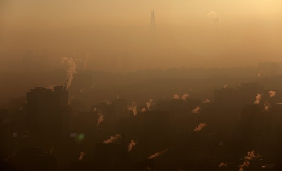 중부지방 초미세먼지 농도가 '나쁨' 수준을 보이는 27일 오전 서울 시내 건물에서 난방 수증기가 나오고 있다. 뉴스1 |