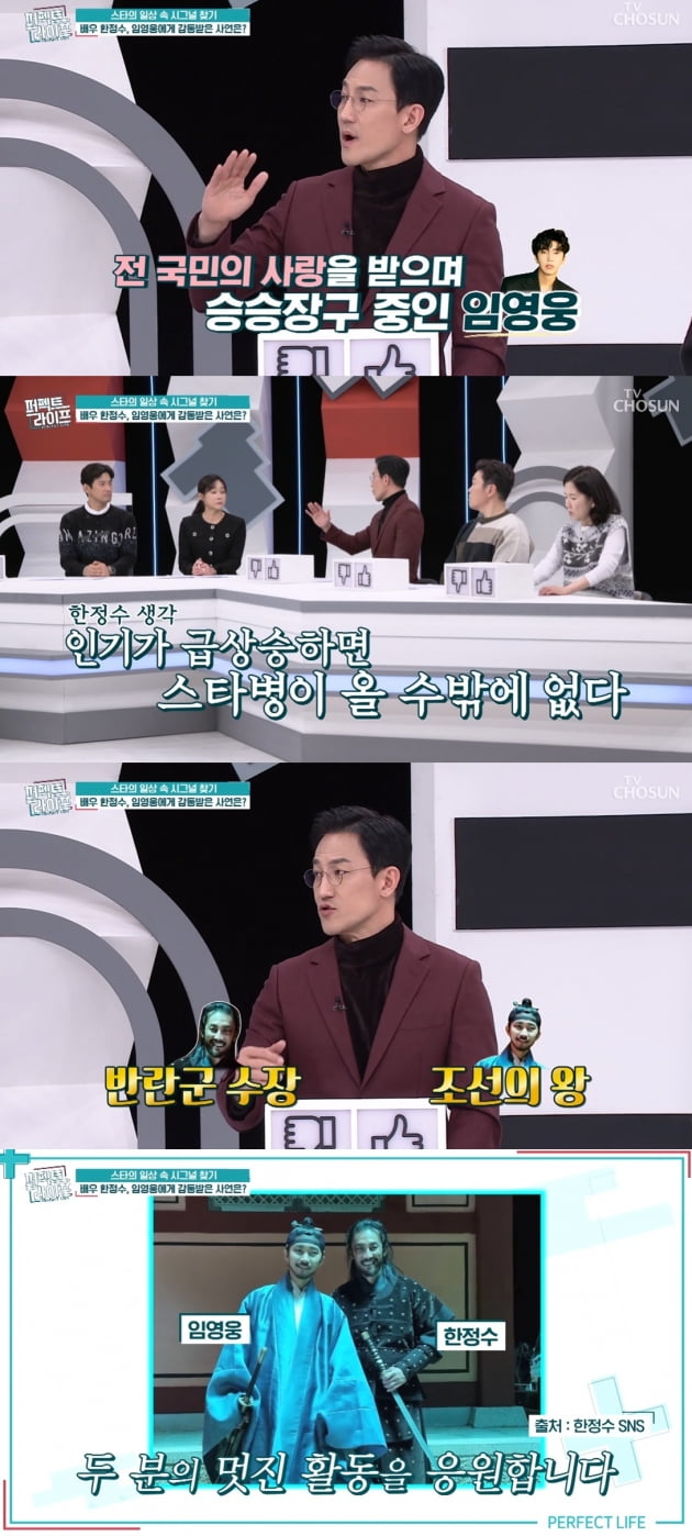 28일 방송된 TV조선 '퍼펙트라이프'에서 한정수는 "임영웅과 직접적인 친분은 없지만, 임영웅의 콘서트 사극 영상 오프닝을 찍기 위해 만났다"고 운을 뗐다.