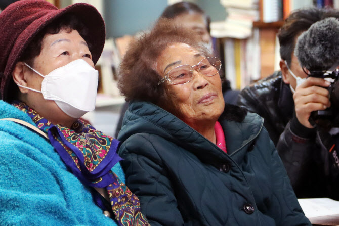 지난달 11일 오후 광주 서구 한 카페에서 강제징용 피해자 양금덕 할머니(오른쪽)가 징용 피해자 인권운동에 앞장섰던 이금주 태평양전쟁희생자 광주유족회장의 별세 1주기 추모식에 참석해 있다. (사진=연합뉴스) |