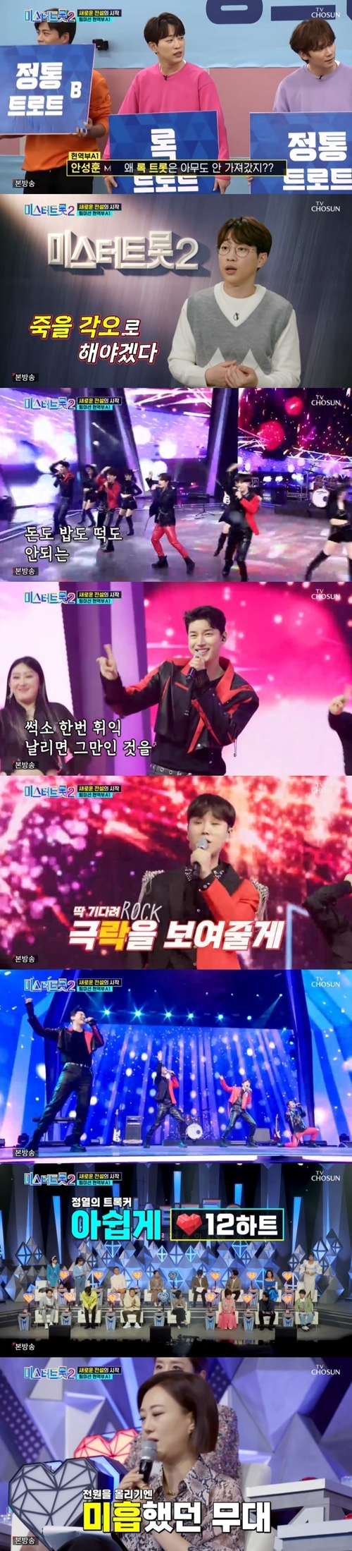 그러던 중 또 한 번의 위기를 겪었다. 안성훈은 “연습을 하다가 ‘미스트롯1’에서 했던 록 트롯 무대를 봤다. 그분들의 무대가 충격적이었다. 노래만 대충 준비해서 가다가는 우린 큰일 난다. 박살 난다 싶었다”라며 각오를 다지는 모습을 보였다.