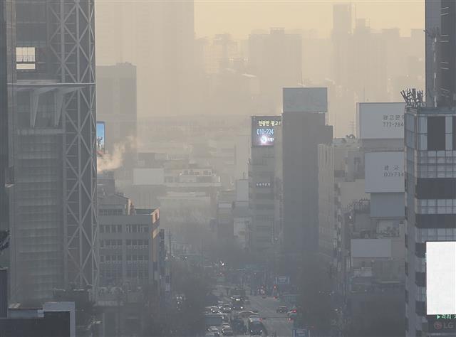 수도권 전역에 미세먼지 예비저감조치 - 수도권 전역에 미세먼지 예비저감조치가 내려진 6일 오전 서울시교육청에서 바라본 도심이 뿌옇게 보이고 있다.뉴스1 |