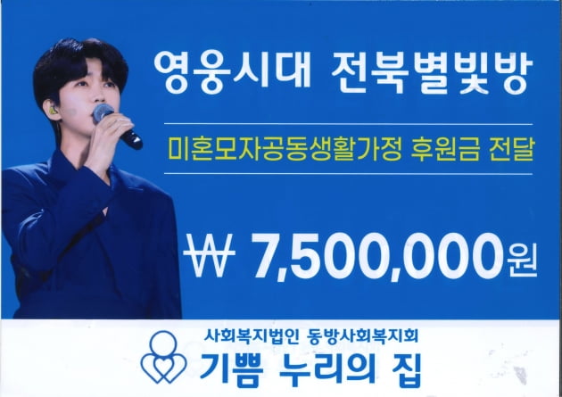 가수 임영웅 팬클럽 ‘영웅시대 전북별빛방’ 회원들이 전주 덕진구 소재 미혼모 보호시설인 ‘기쁨누리의집’에 미혼모 자립기반을 위한 지원금 750만 원을 1월 5일에 후원했다고 밝혔다.