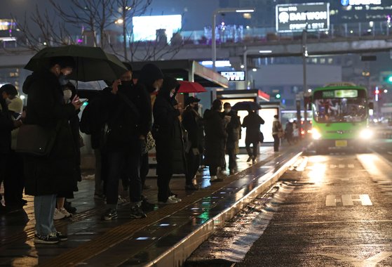서울을 비롯한 수도권 대부분 지역에 눈이 내린 지난해 12월 21일 오후 서울역 버스종합환승센터에서 시민들이 버스를 기다리고 있다. [연합뉴스] |