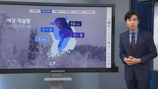 경기 동부와 충북 쪽에 최고 8cm, 서울 동쪽지역에도 1~5cm의 눈이 쌓일 것으로 보입니다.