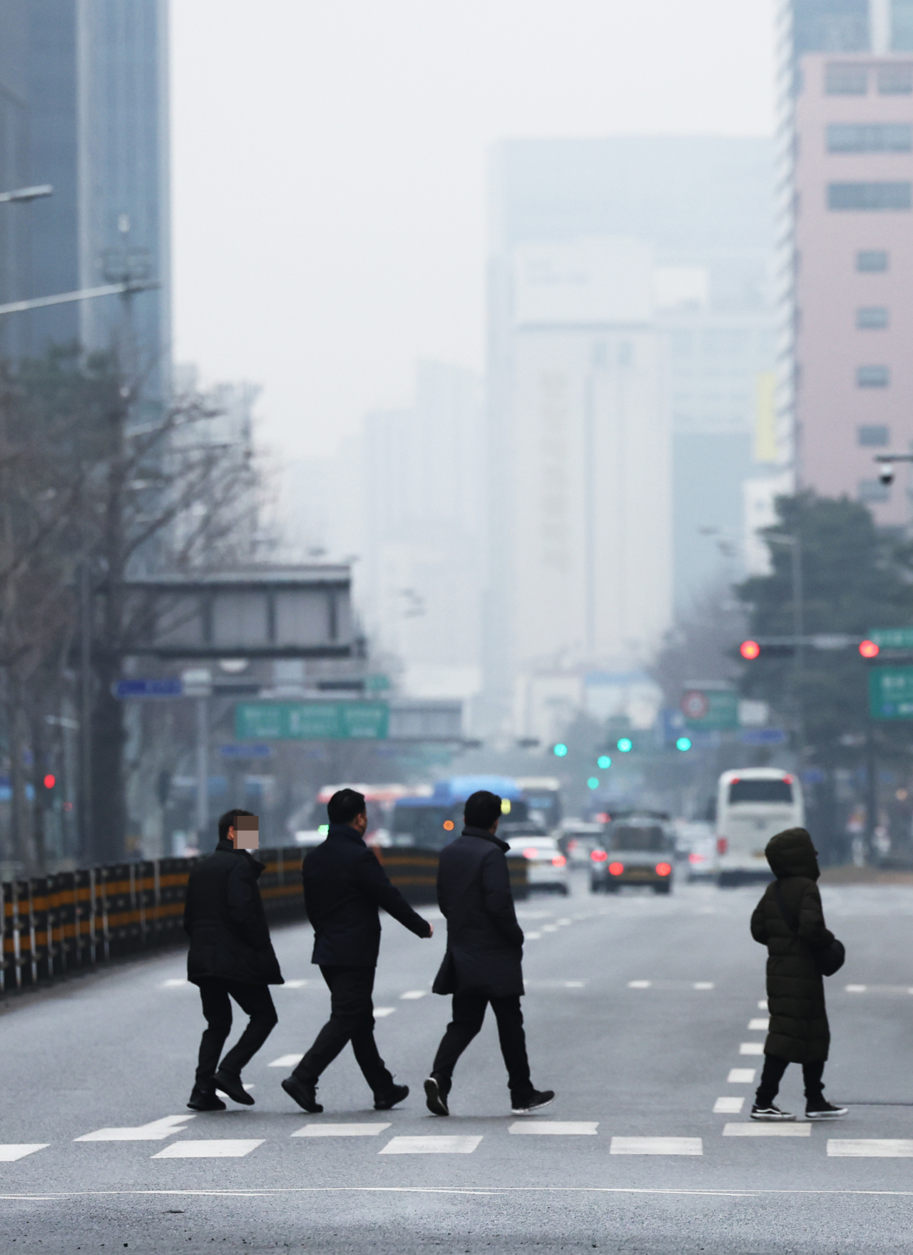 서울의 초미세먼지와 미세먼지 농도가 각각 매우 나쁨과 나쁨을 기록한 7일 서울 도심에서 시민들이 횡단보도를 건너고 있다.[연합뉴스 제공] |