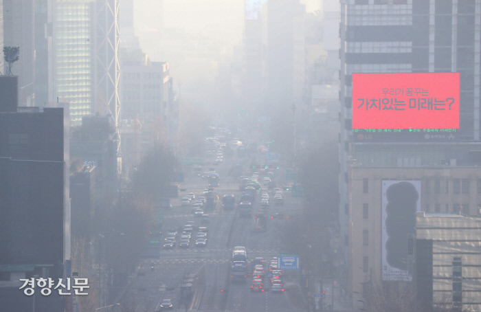 수도권을 비롯해 9개 시·도에 미세먼지 비상저감조치가 시행된 8일 서울 종로 일대의 건물과 도로가 미세먼지로 인해 뿌옇게 보인다. 서성일 선임기자 |