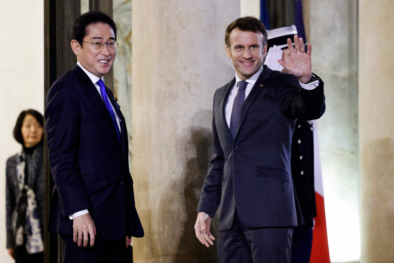 9일(현지시간) 프랑스 파리 엘리제궁에서 (오른쪽부터) 에마뉘엘 마크롱 프랑스 대통령이 기시다 후미오 일본 총리를 맞이하고 있다. [AFP] |