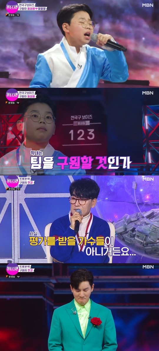 10일 방송된 MBN ‘불타는 트롯맨’ 에서는 구원자전이 펼쳐졌다. 앞선 팀 대결에서 패배해 본선 탈락 위기에 놓인 팀들이 멤버 중 한 명을 '구원자'로 내세워 대결하는 것으로, 현장에 자리한 국민 대표단으로부터 많은 표를 얻은 1팀이 생존하는 게임이었다.