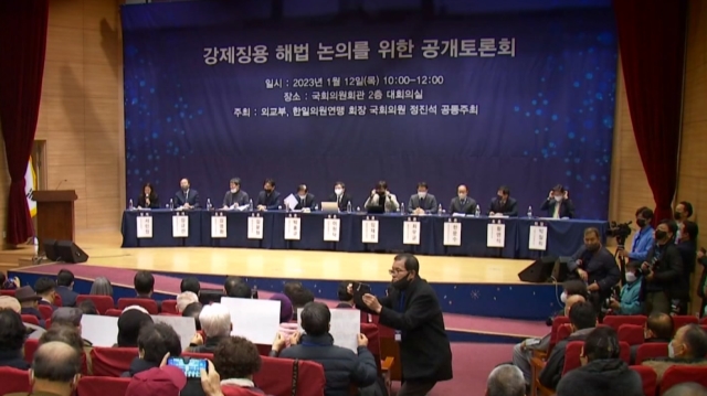 오늘 사실상 최종안이 공개됐습니다. 국회에서 열린 공개 토론회를 통해서입니다. 일부 피해자와 대리인단이 보이콧한 상태였습니다. 토론회 자료, 외교부가 보안상의 이유를 들어 공개하지 않은 것을 문제삼은 것입니다. 민주당도 같은 이유에서 토론회에 참석하지 않았는데요. 이 때문에 원래 한일의원연맹 차원에서 주관하려던 오늘 행사, 연맹 회장인 정진석 국민의힘 비대위원장 이름만 올린 채 열렸습니다. 정 위원장은 비대위원들을 대동하고 토론회장에 나타났습니다.