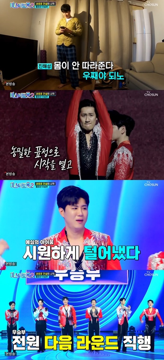 모두 다른 오디션의 우승자인 만큼 노래에는 문제가 없었으나, 예상 밖의 난관이 있었다. 진해성이 트롯계의 이름난 몸치였던 것. 진해성은 주변에서 춤을 추면 안된다는 말을 듣는다며 "이상하게 춤선이 안 좋아요, 제가 다른사람보다 늦고 하기 때문에 미안하더라고요" 라며 팀원들에게 미안해했다. 그는 "형님들은 다 잘하시니까 닮아가면 돼" 라는 생각으로 연습에 매진했다. 그 결과, 우승부의 무대는 '올하트'를 획득했다. 멤버 전원은 올하트의 순간에 눈물을 흘렸다.