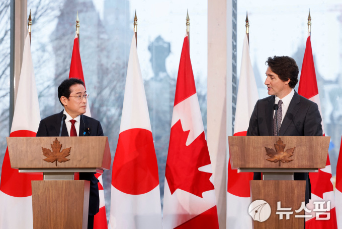 정상회담 후 기자회견하고 있는 기시다 후미오 일본 총리(왼쪽)와 쥐스탱 트뤼도 캐나다 총리. [사진=로이터 뉴스핌] 2023.01.13 |